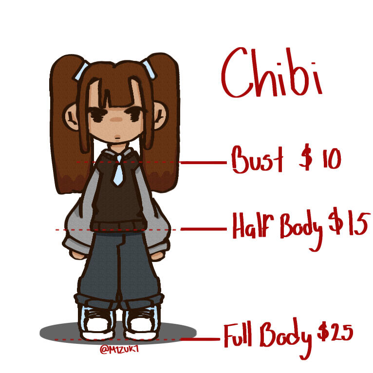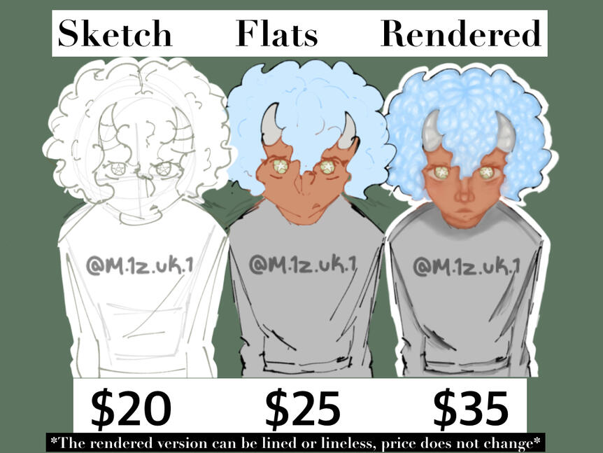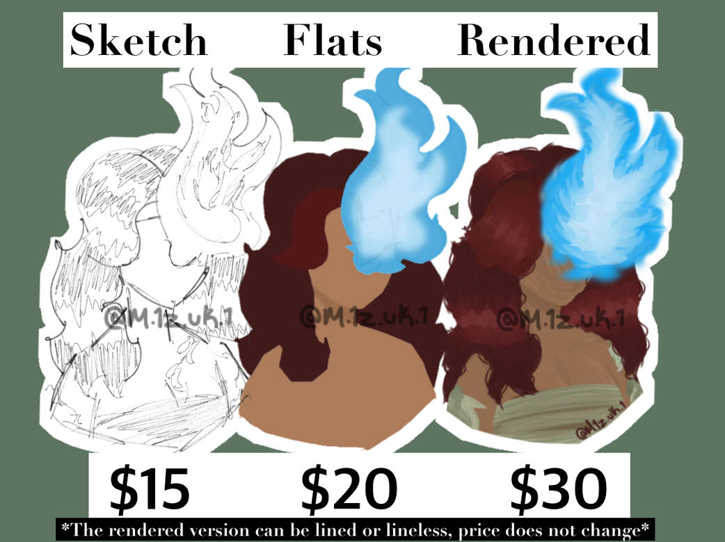 A watermarked version of the final drawing will be sent to ensure that the commission is what the customer wanted. Once the remaining balance is received, a final, unwatermarked, image will be made available. The right to post any commission online to social platforms is retained by the artist, unless otherwise explicitly indicated by the customer during the sketching phase.Commissions will be worked on in the order they are received. Timing and delivery requirements must be agreed upon prior to the sketching phase. Commission periods can range from anywhere between 1 week to 1 month. Regular updates will be provided from the date the deposit is received to the date of delivery. Payment information will only be provided once a price is agreed upon. Payments can be made through Cashapp or Paypal.Below is a chart listing fees and additional charges a customer may be subjected to: